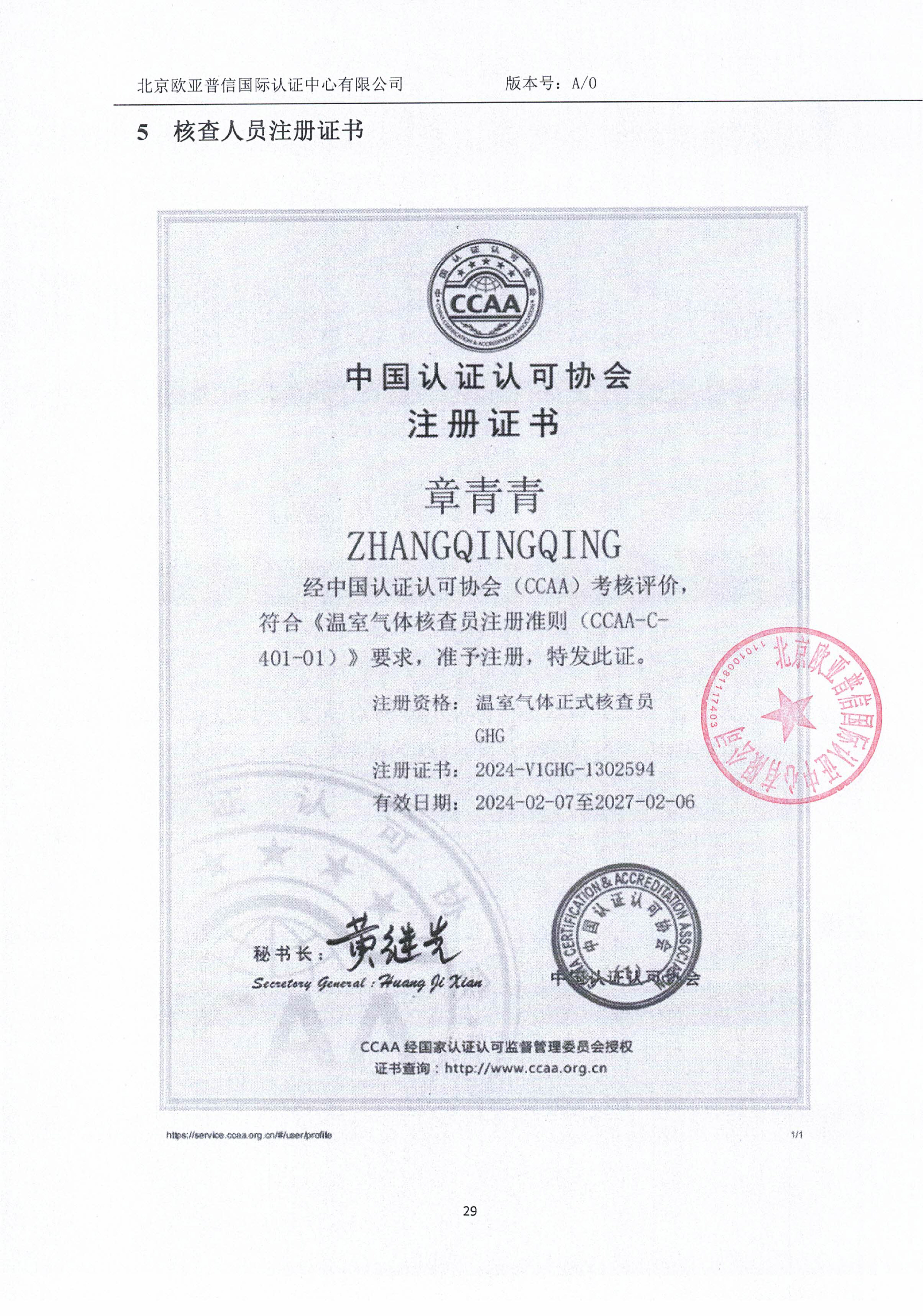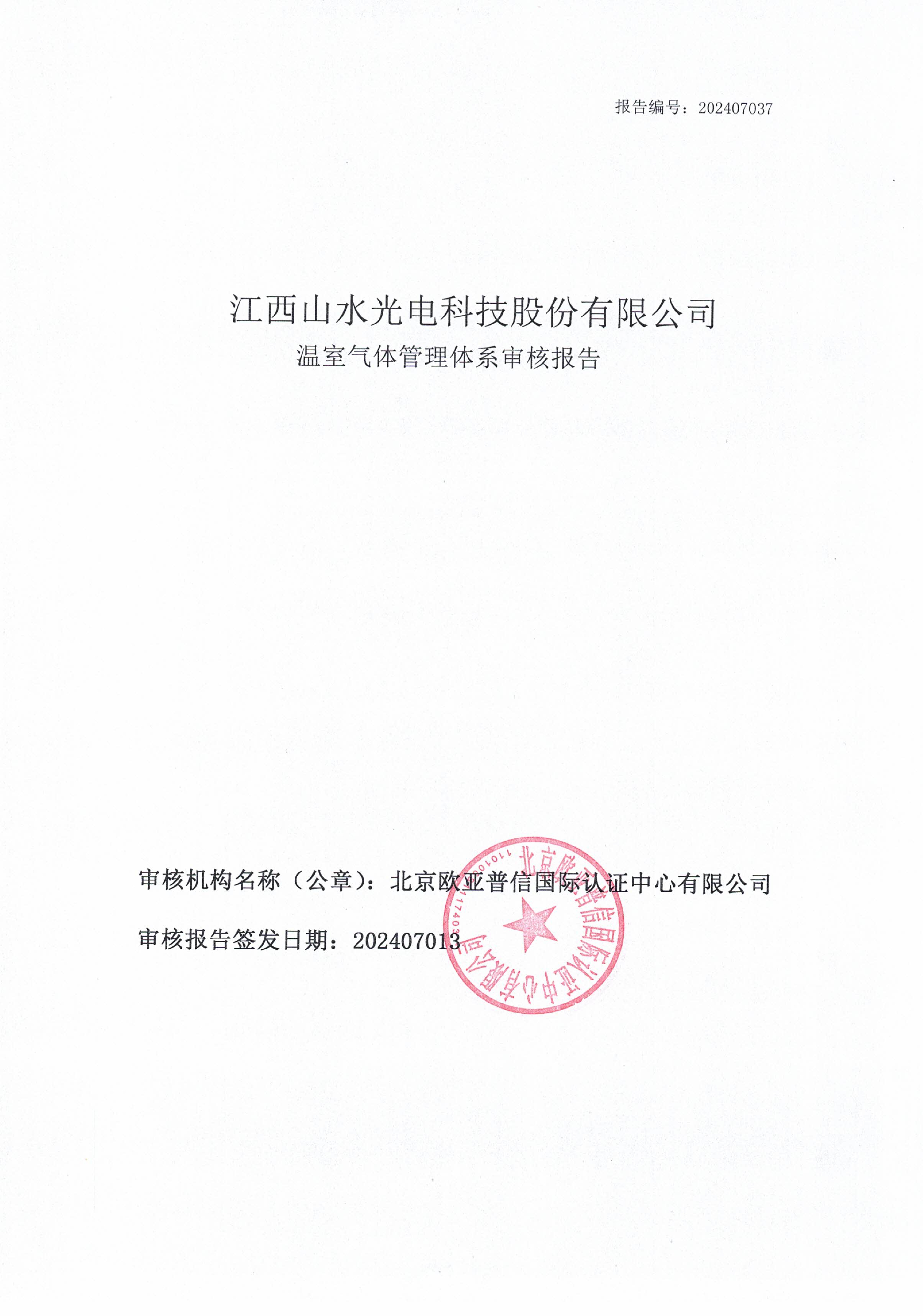 江西山水光电科技股份有限公司2023年度温室气体已通过北京欧亚普信国际认证中心核查并认证,相关证书和报告如下: